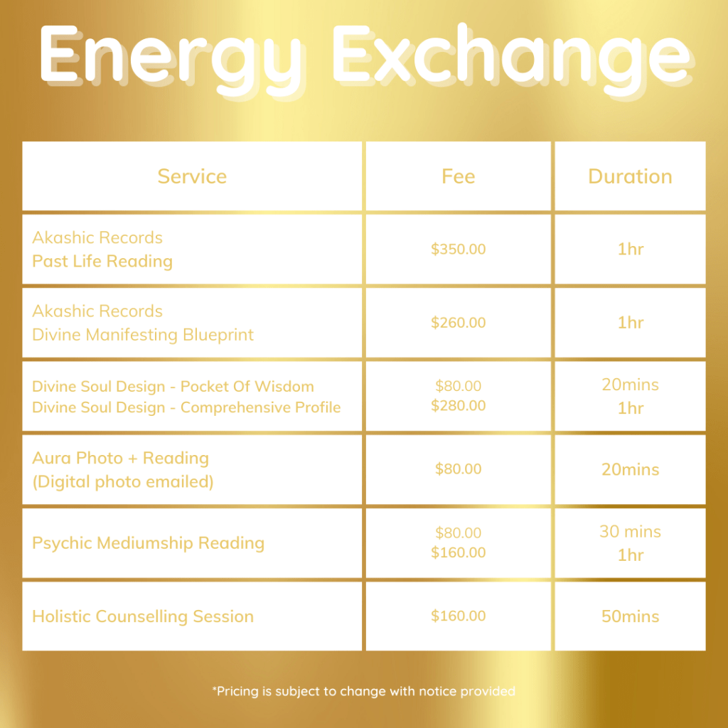 Aura Reader – Akashic Reader – Spiritual Intuitive – Psychic Medium – Akashic Past Life Reader – Divine Soul Design Creator -Soul Realignment Practitioner – Holistic Counsellor